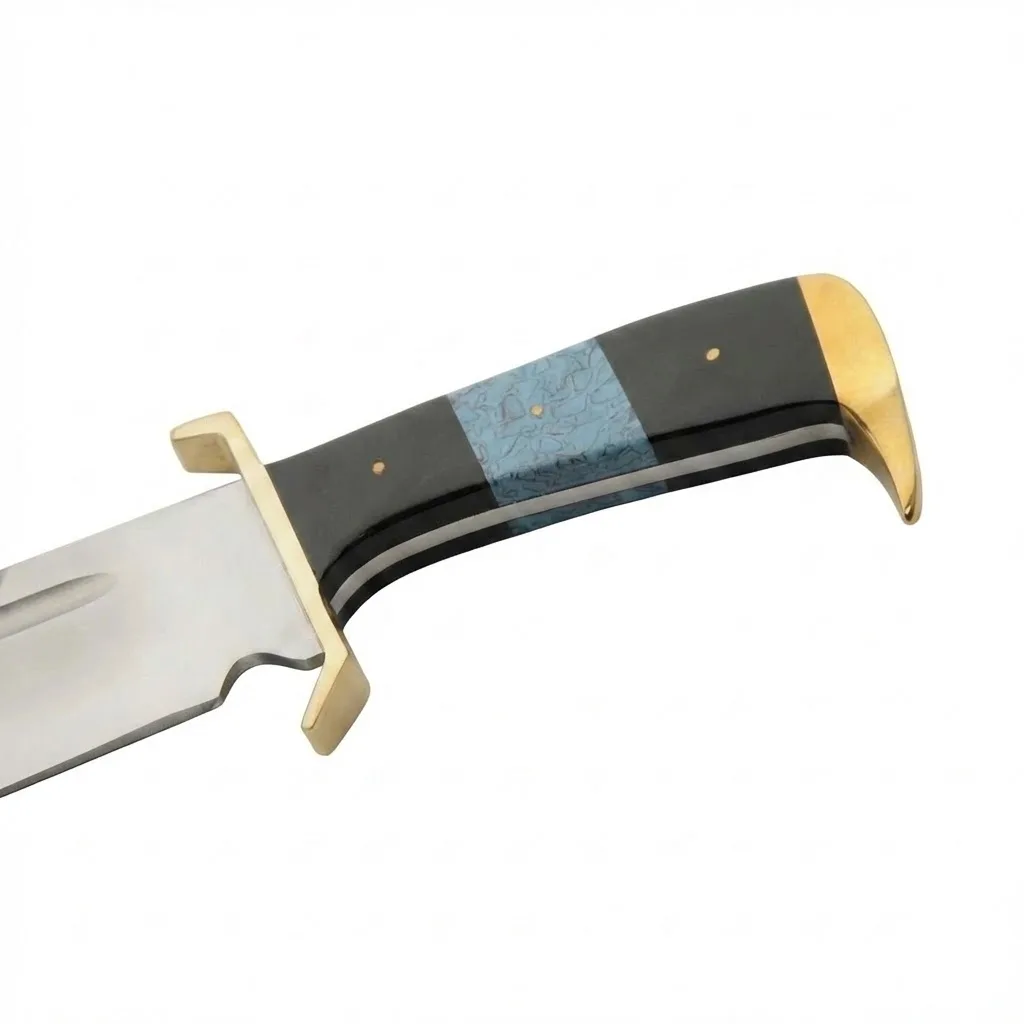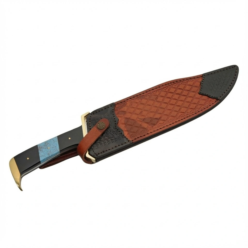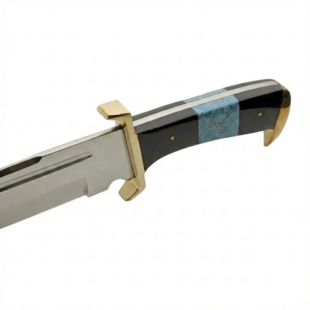 The Turquoise Monster 18″ Custom Bowie Knife Command the outdoors with this massive 18-inch fixed-blade Bowie. Featuring a 12.5-inch mirror-polished stainless steel blade and a striking black and faux-turquoise handle, this knife blends rugged utility with collector-grade artistry. Detailed filework along the spine and handle, paired with solid steel bolsters and a premium leather sheath, makes this the ultimate centerpiece for hunters and Western enthusiasts alike.