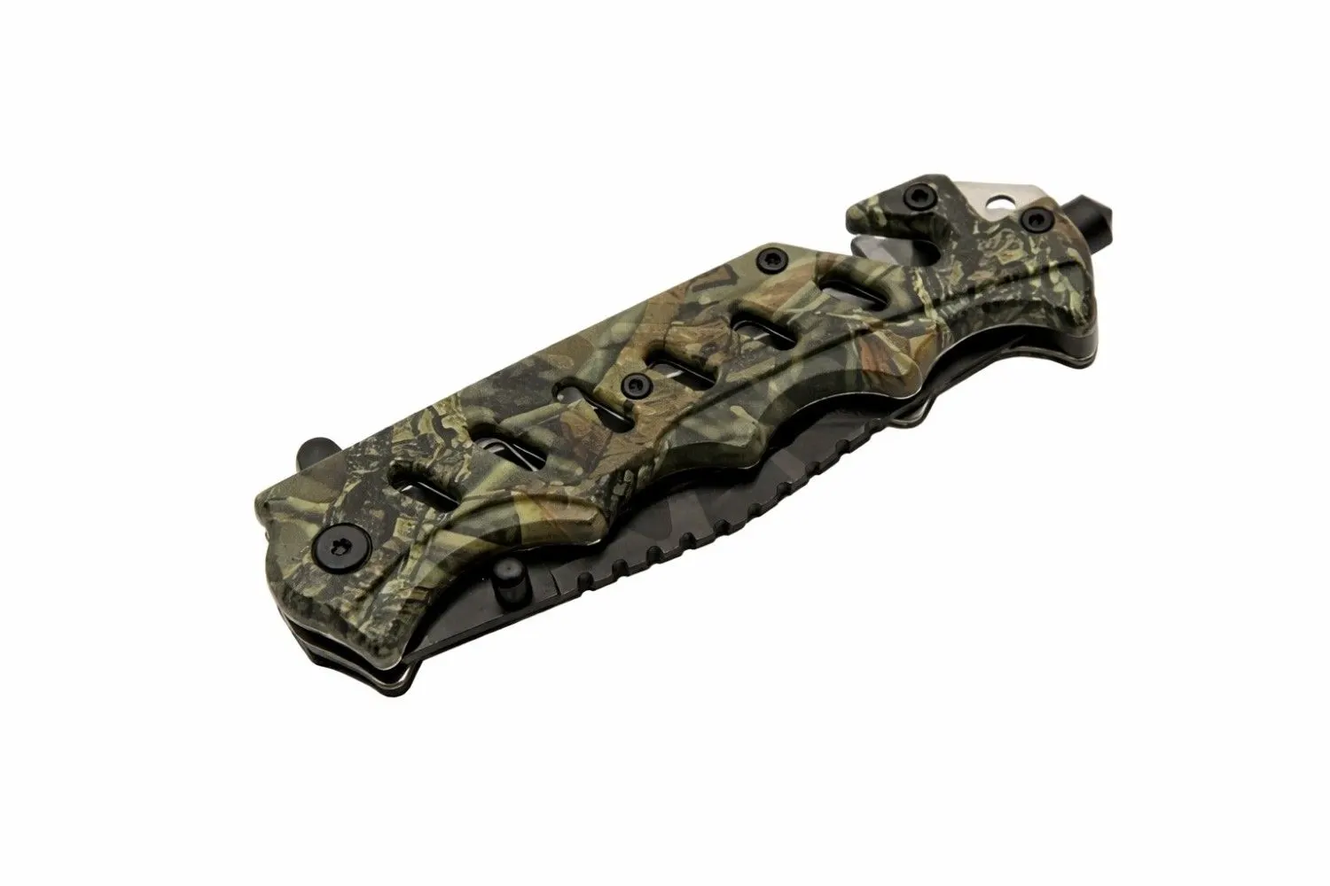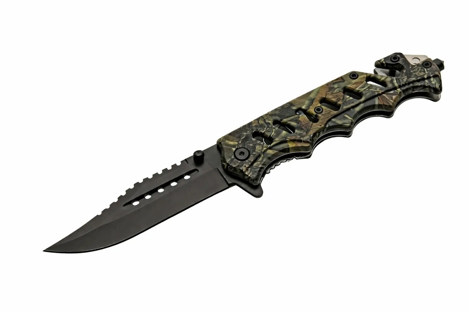 This assisted opening camo folding knife features a durable ABS composite handle and a versatile black-coated blade designed for reliable daily utility. Built for those who prioritize preparedness, this folding tool integrates essential safety features into a rugged, camouflage aesthetic.