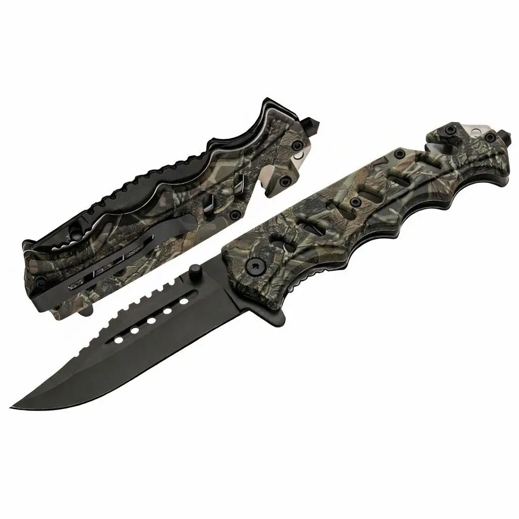 The Camo Tactical Folder is a purpose-built folding knife designed for high-stakes environments and dependable everyday carry. This assisted opening camo folding knife combines a non-reflective black finish with a textured camouflage grip, ensuring it remains both functional and discreet during outdoor or utility tasks.