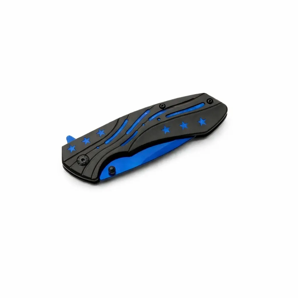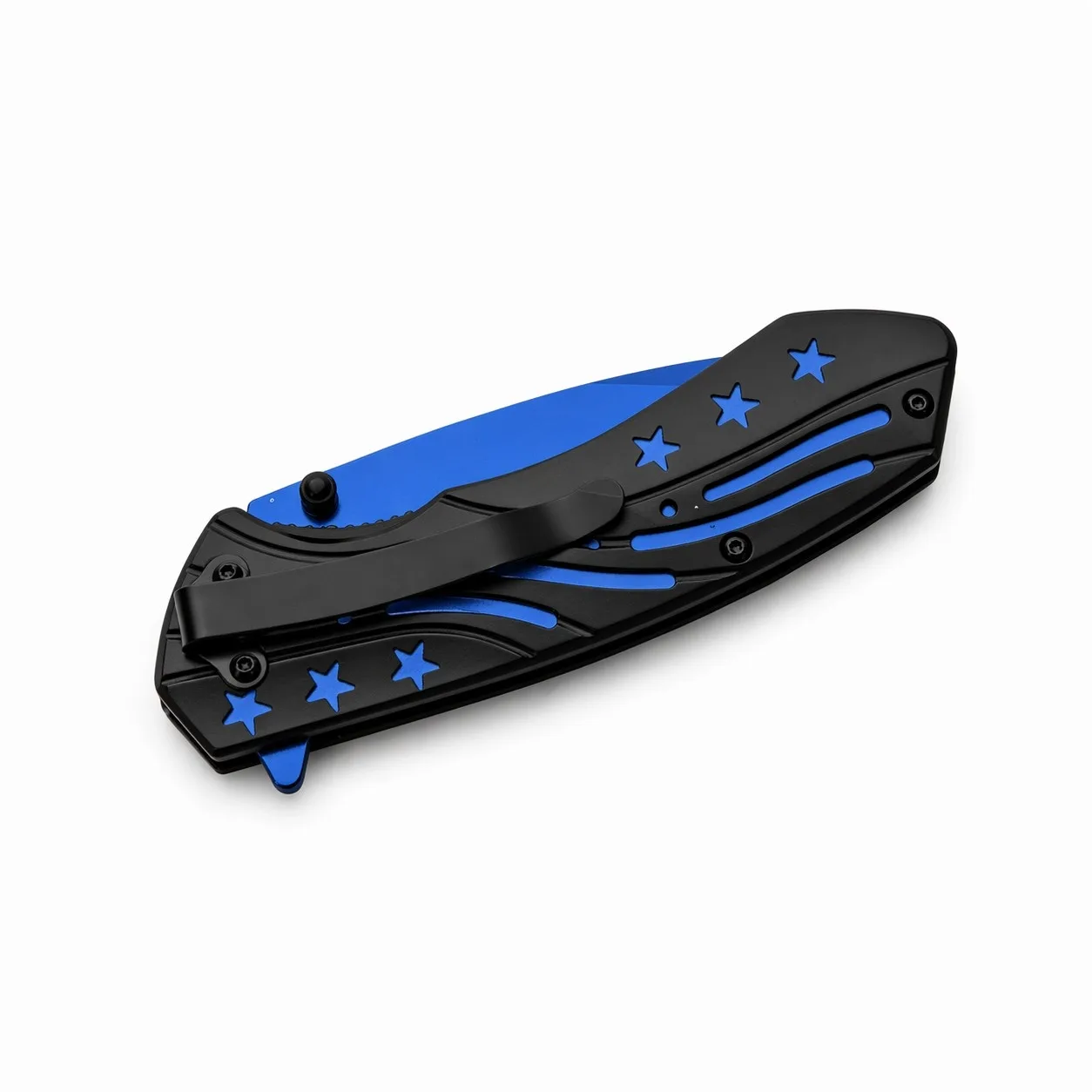 The Blue Stars Liner Lock is a precision-engineered folding knife featuring a 3Cr13 blue-coated stainless steel blade designed for reliable daily performance. Encased in a durable aluminum handle with a thematic stars and stripes motif, this folder offers a secure grip and a dependable locking mechanism for the serious user.