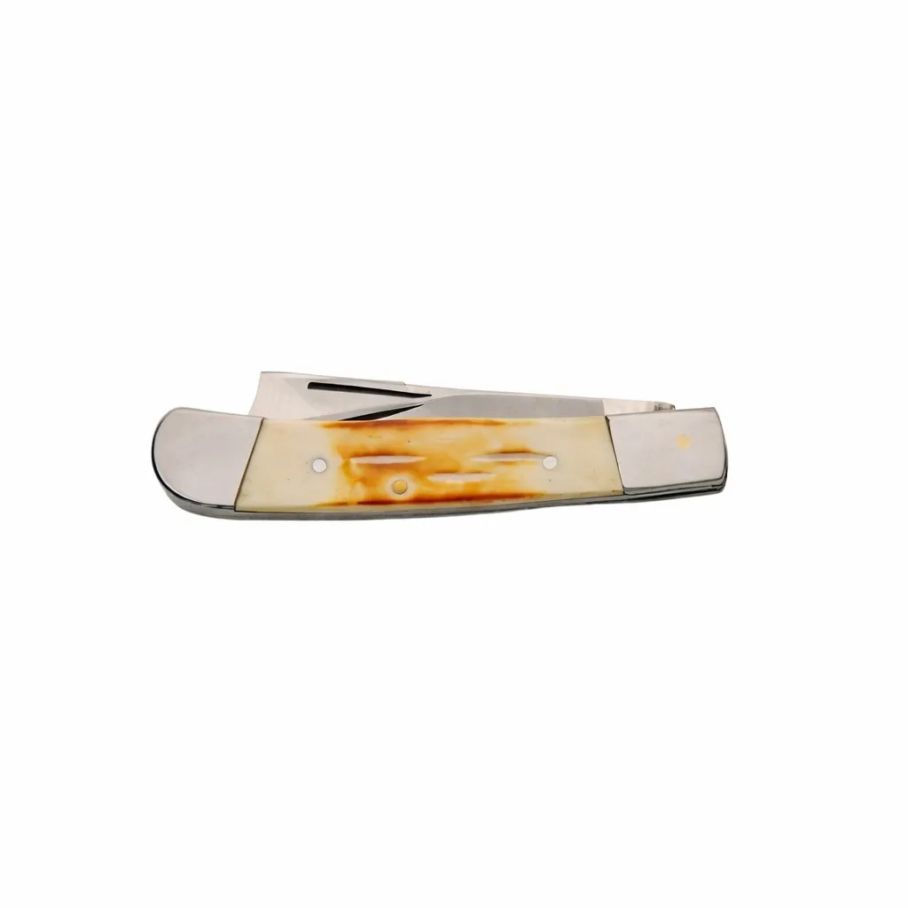 This bone handle razor trapper knife features a classic dual-blade configuration, including a specialized razor blade and a traditional clip point. Crafted with authentic smooth bone handles and high-polish bolsters, this folder is a staple for collectors who appreciate heritage-style pocket knives.