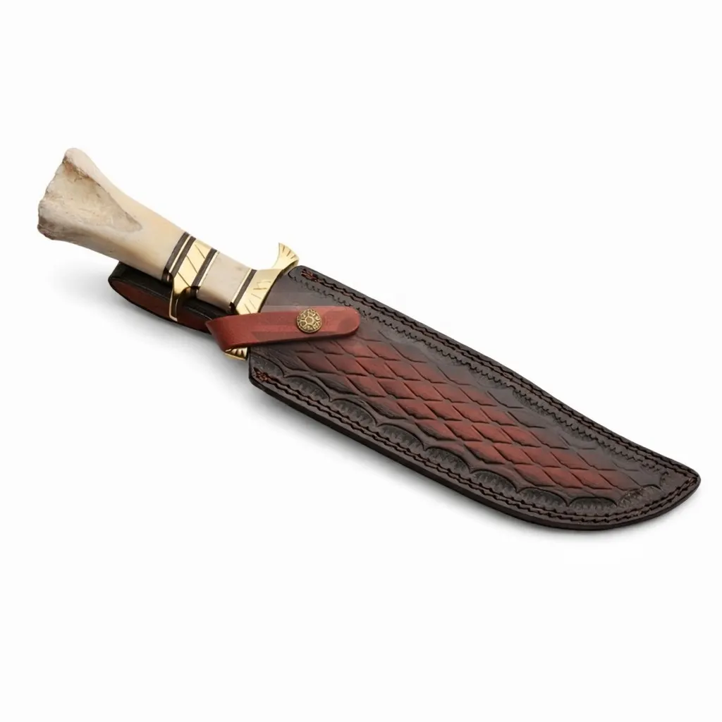 Experience the perfect blend of frontier tradition and modern reliability. This substantial 16-inch fixed blade features a 10-inch polished stainless steel blade designed for superior corrosion resistance and a razor-sharp edge. The handle is masterfully handcrafted from genuine camel bone, accented by a solid brass guard for maximum safety and a classic aesthetic.Whether you are a serious hunter heading into the backcountry or a dedicated collector seeking an heirloom-quality piece, this Bowie knife delivers the precision and durability required for heavy-duty field use. Includes a custom, hand-stitched leather belt sheath for secure carry.