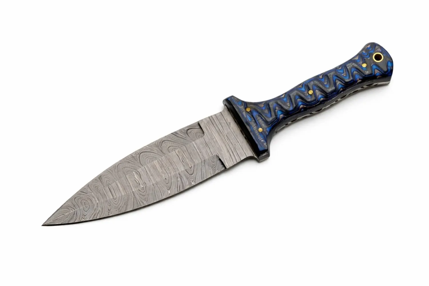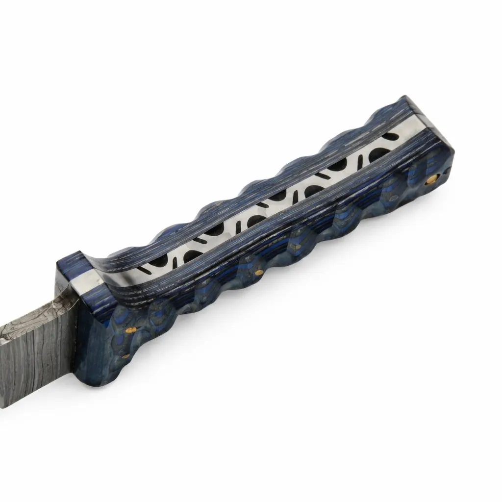 Each blade is crafted from high-contrast Damascus Knives steel, layered to provide both edge retention and a unique visual signature. The 4.5″ handle is constructed from Grooved Blue Wood, secured with traditional brass pins to ensure a lifetime of structural integrity. Detailed filework along the spine showcases the hand-finished nature of this piece, elevating it from a standard tool to a work of functional art.