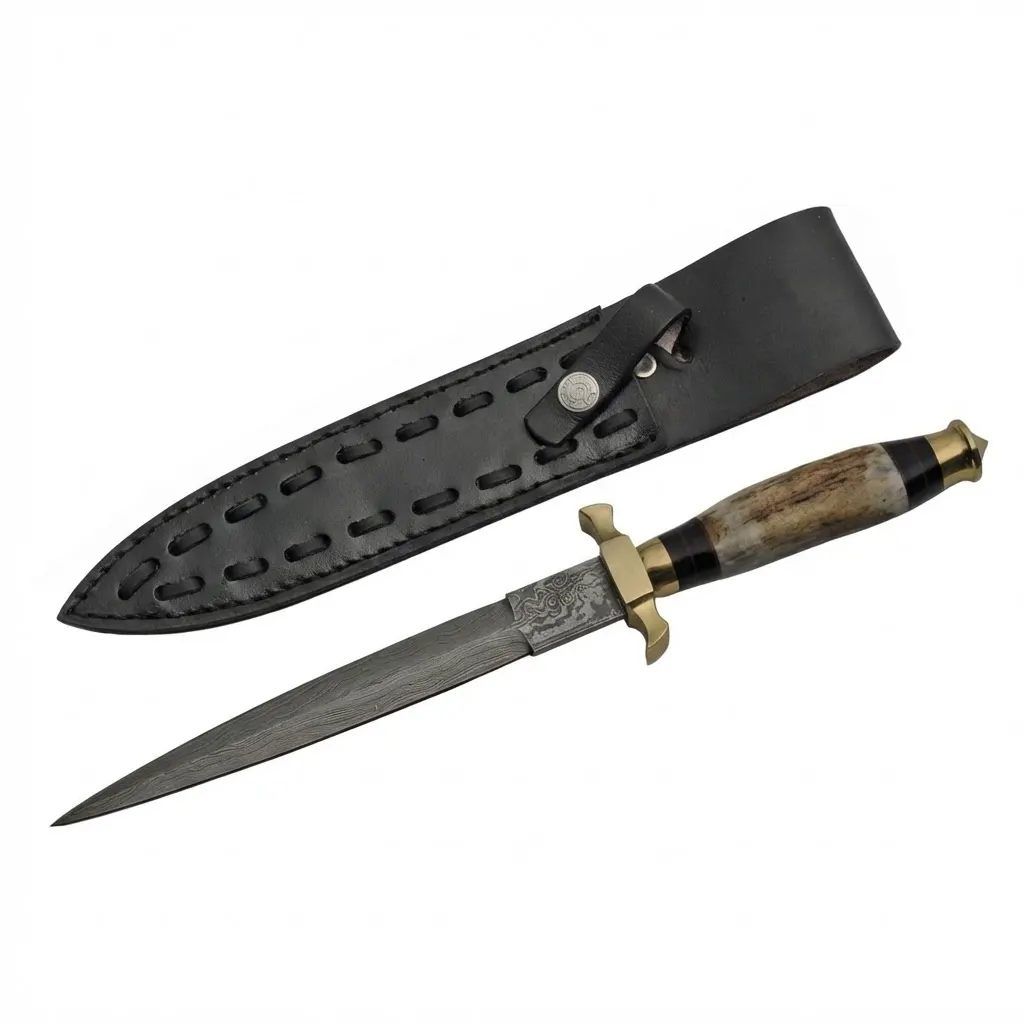 The 12.5″ Stag Athame Damascus Dagger is a premium fixed blade designed for collectors and outdoor enthusiasts who value craftsmanship and performance. Featuring a hand-forged Damascus steel blade and genuine stag handle, this dagger delivers strength, balance, and a distinctive look for display or field use.