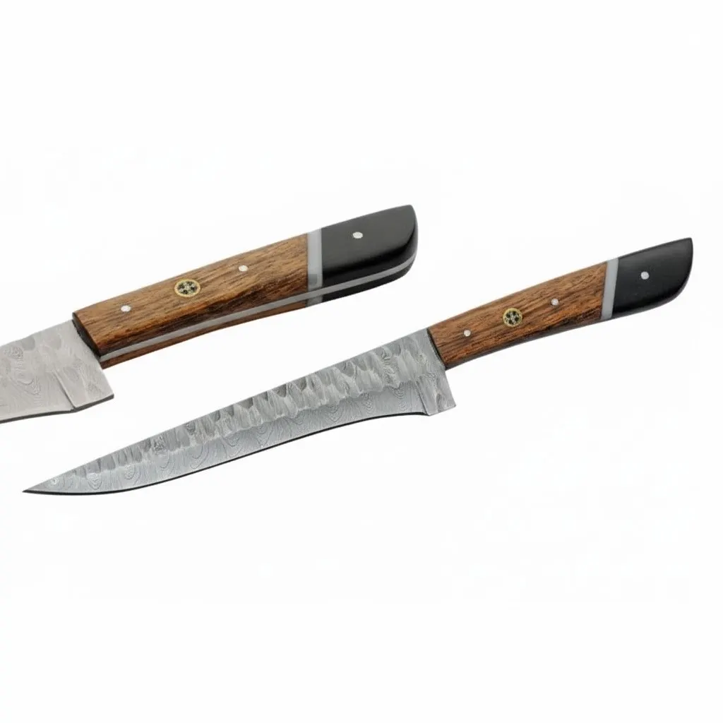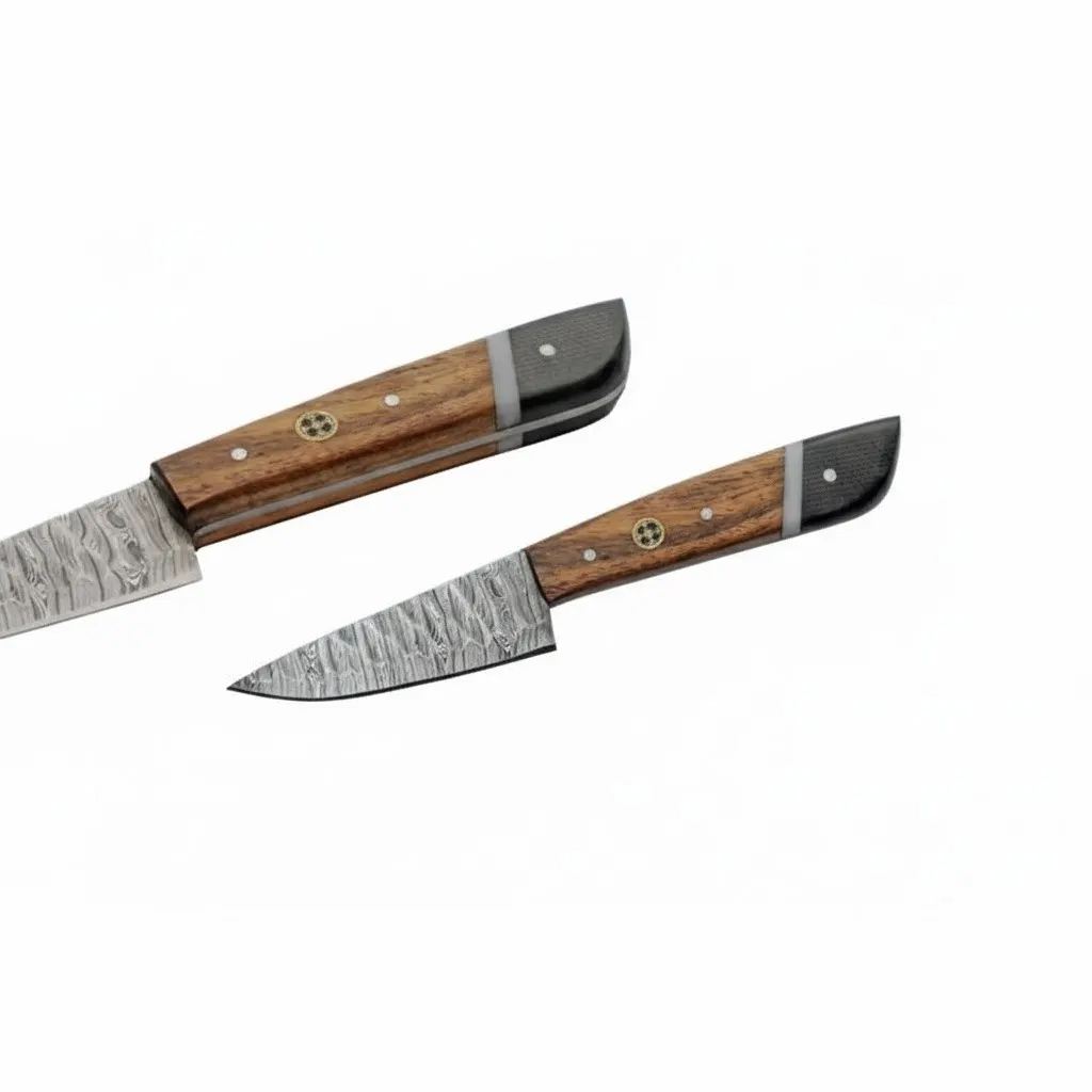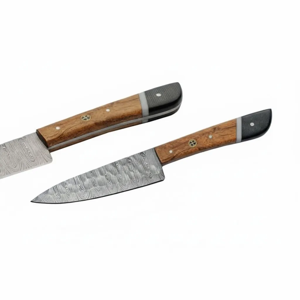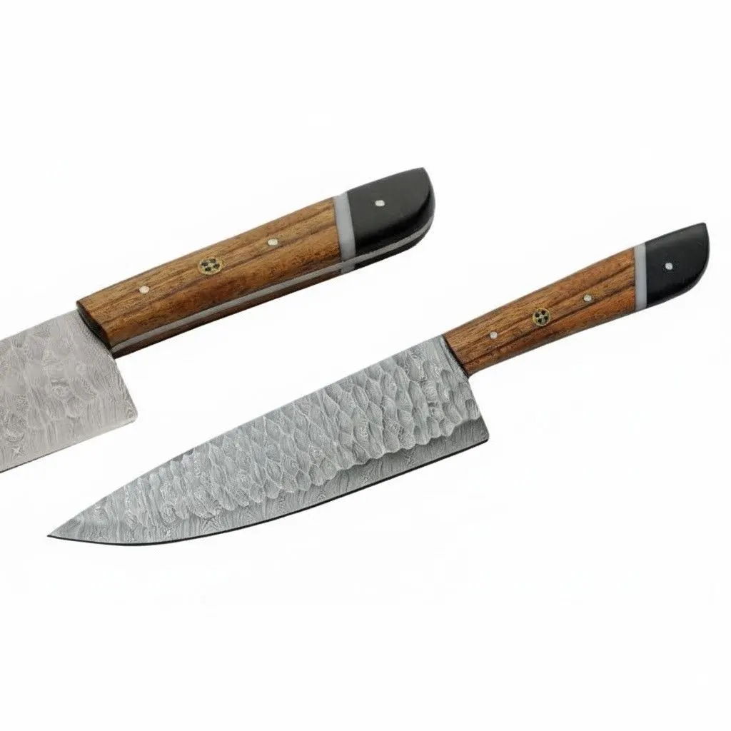 Every blade in this collection is forged from premium Damascus steel, characterized by its signature rippled aesthetic and exceptional edge retention. The handles are constructed from a high-quality Black Micarta and Wood blend high-pressure materials known for their incredible resistance to moisture and heat finished with a decorative mosaic pin and a polished bolster for a balanced, ergonomic grip.