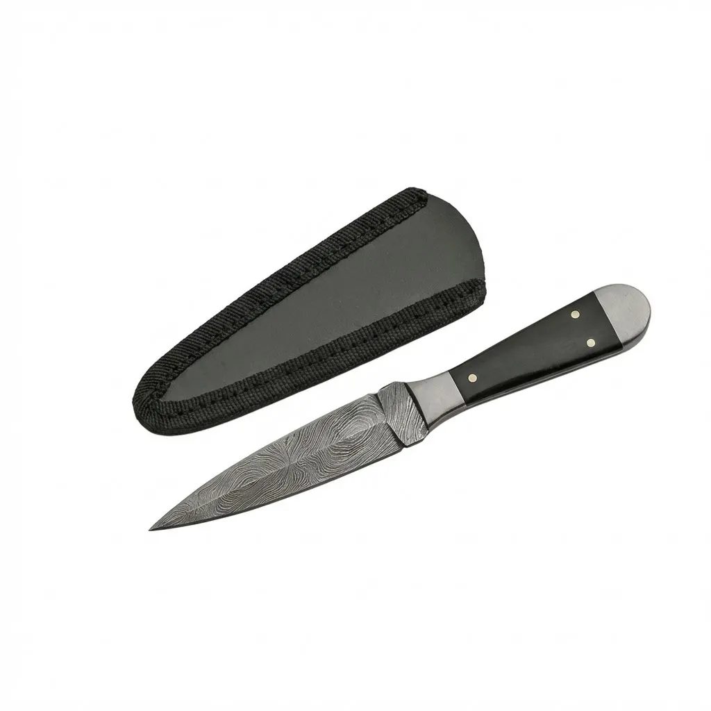 Crafted with meticulous attention to detail, this dagger features a 3.5-inch blade hand-forged from genuine Damascus knives, created by layering multiple grades of metal to produce its iconic, wavy “water” pattern. This traditional forging process does more than just create a stunning visual; it ensures superior edge retention and a unique finish that guarantees no two blades are ever identical.The handle is masterfully carved from natural horn, polished to a high-gloss sheen that highlights the material’s rich, organic grain for a premium feel in the hand. For uncompromising structural integrity, a stainless steel bolster provides a seamless transition from the blade to the grip, while traditional brass pin fasteners reinforce the full-tang construction, ensuring the handle remains rock-solid and secure through years of rigorous use.