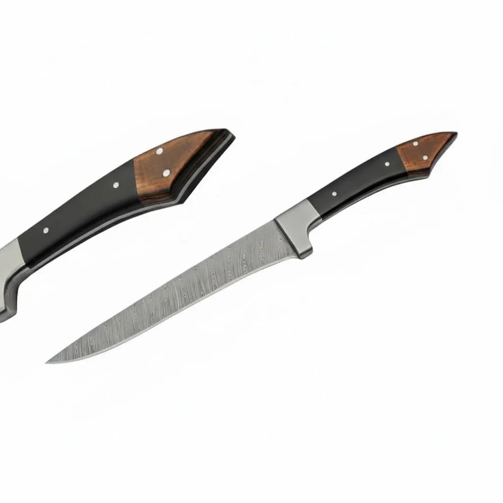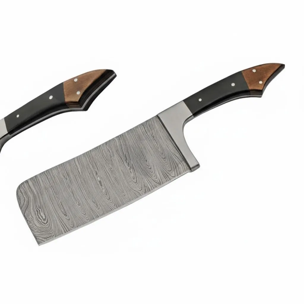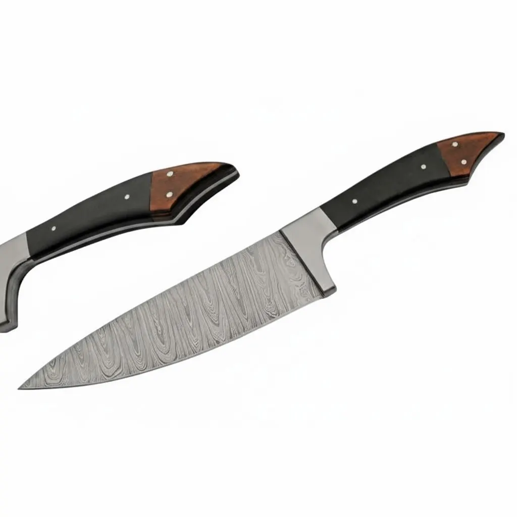 At the heart of every knife is a genuine Damascus steel blade, renowned for its iconic layered patterning and exceptional strength. Each blade is hand-forged to ensure superior edge retention and a razor-sharp finish. To complement the steel, the handles are crafted from polished natural wood, reinforced with stainless steel guards (bolsters). This combination provides a refined aesthetic and a secure, balanced grip that stands the test of time, even in the most demanding kitchen environments.