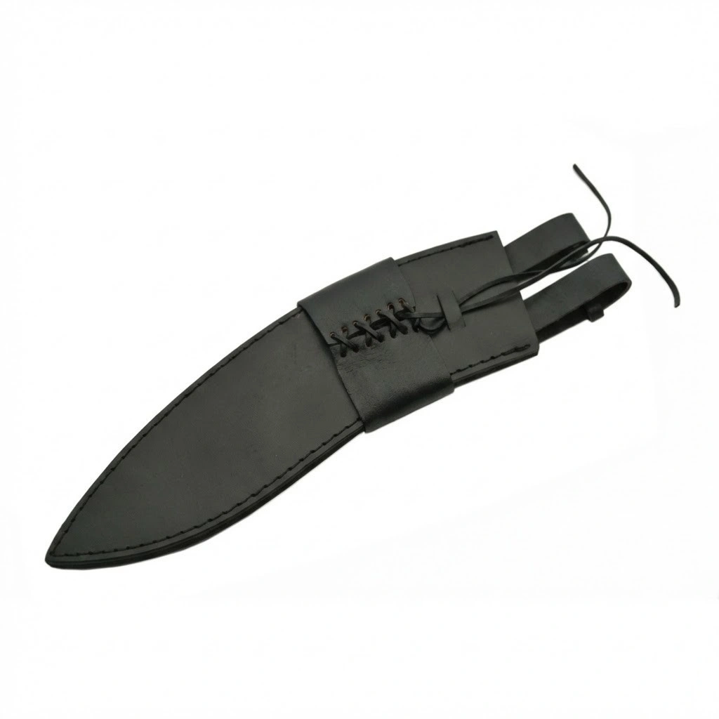 Functionality drives the design of this Kukri. The recurve belly allows for deep bites into wood, while the narrower section near the handle allows for controlled carving. A standout feature of this set is the inclusion of the two small 4.75″ knives: the traditional “Karda” (utility knife) and “Chakmak” (blunt sharpening tool). This turns the Kukri into a complete field maintenance system. The leather sheath is custom-fitted to hold all three tools securely on your belt.