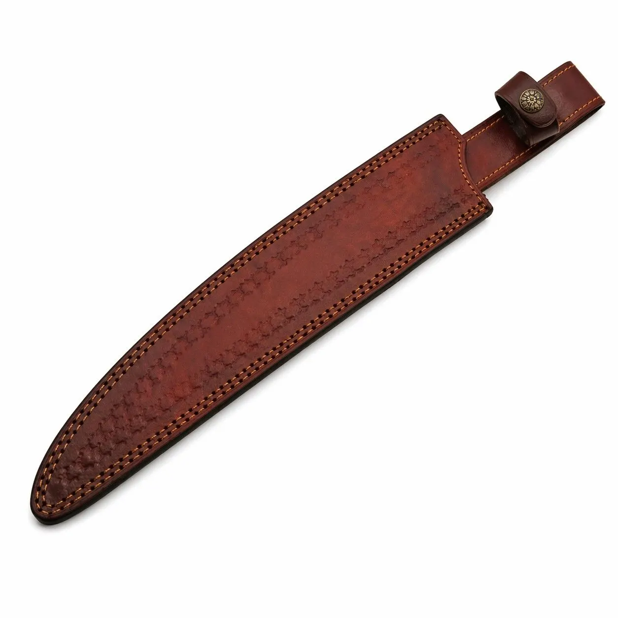 The long, sweeping profile of this machete is designed for fluid motion and high-impact use. The grooved texture of the handle provides a mechanical advantage, ensuring a secure grip even when hands are wet or gloved. A dedicated brass lanyard hole at the base of the handle offers a secondary retention point for safety during heavy swinging. The accompanying leather sheath is hand-stitched and features a reinforced belt loop for secure, vertical carry.
