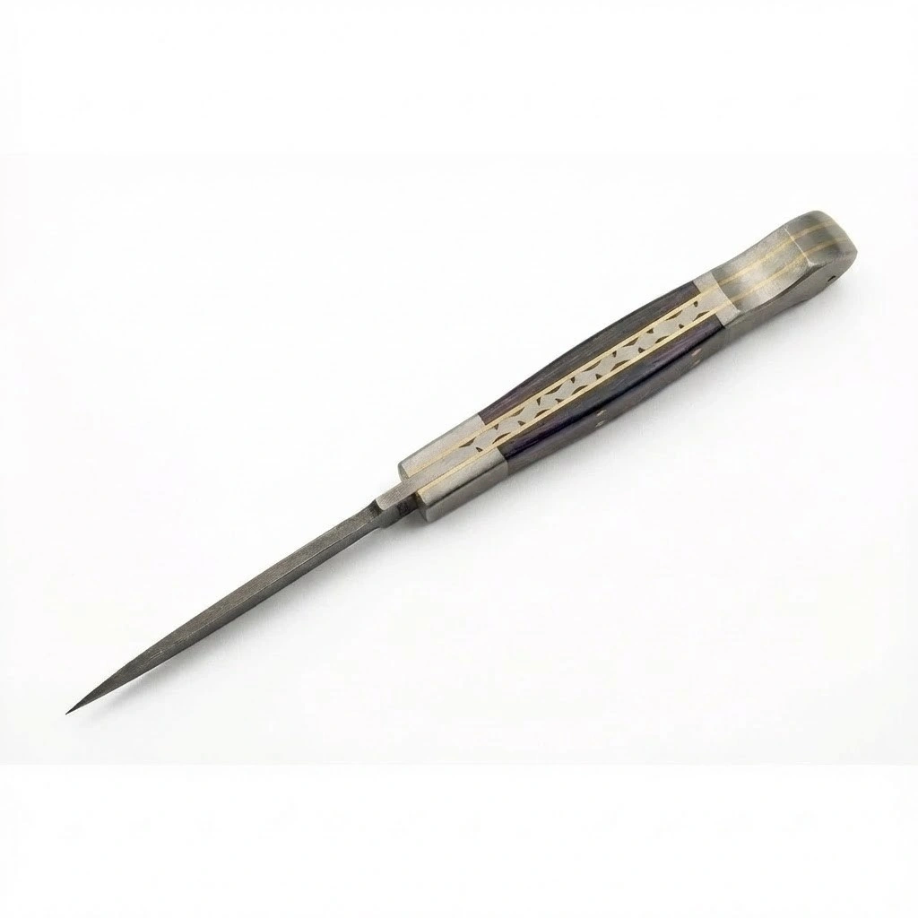 This Axevar Damascus folding knife is defined by its “Amethyst” style aesthetic, pairing a rich purple wood handle with sophisticated silver metalwork. Designed for the user who appreciates fine details, it serves as a high-end tool for everyday carry or display. The classic lockback design and handcrafted details ensure this piece is a timeless addition to any collection.
