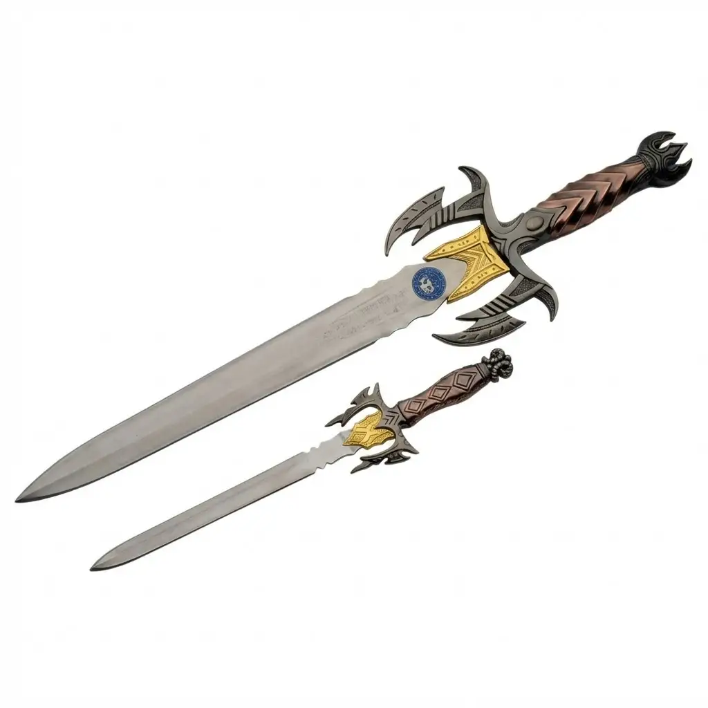 The set’s superior craftsmanship is headlined by its low-maintenance stainless steel blades, which are polished to a high mirror sheen to ensure they remain rust and tarnish-resistant over time. Stability meets style in the ornate metal hilt, where the handles and guards are engineered from heavy cast metal to provide a realistic weight and a premium feel in the hand. This durability is complemented by a sophisticated tri-tone finish, utilizing a dark antique pewter base highlighted by rich brass and gold accents on the guard and pommel to further accentuate the complex, mythical molded details.