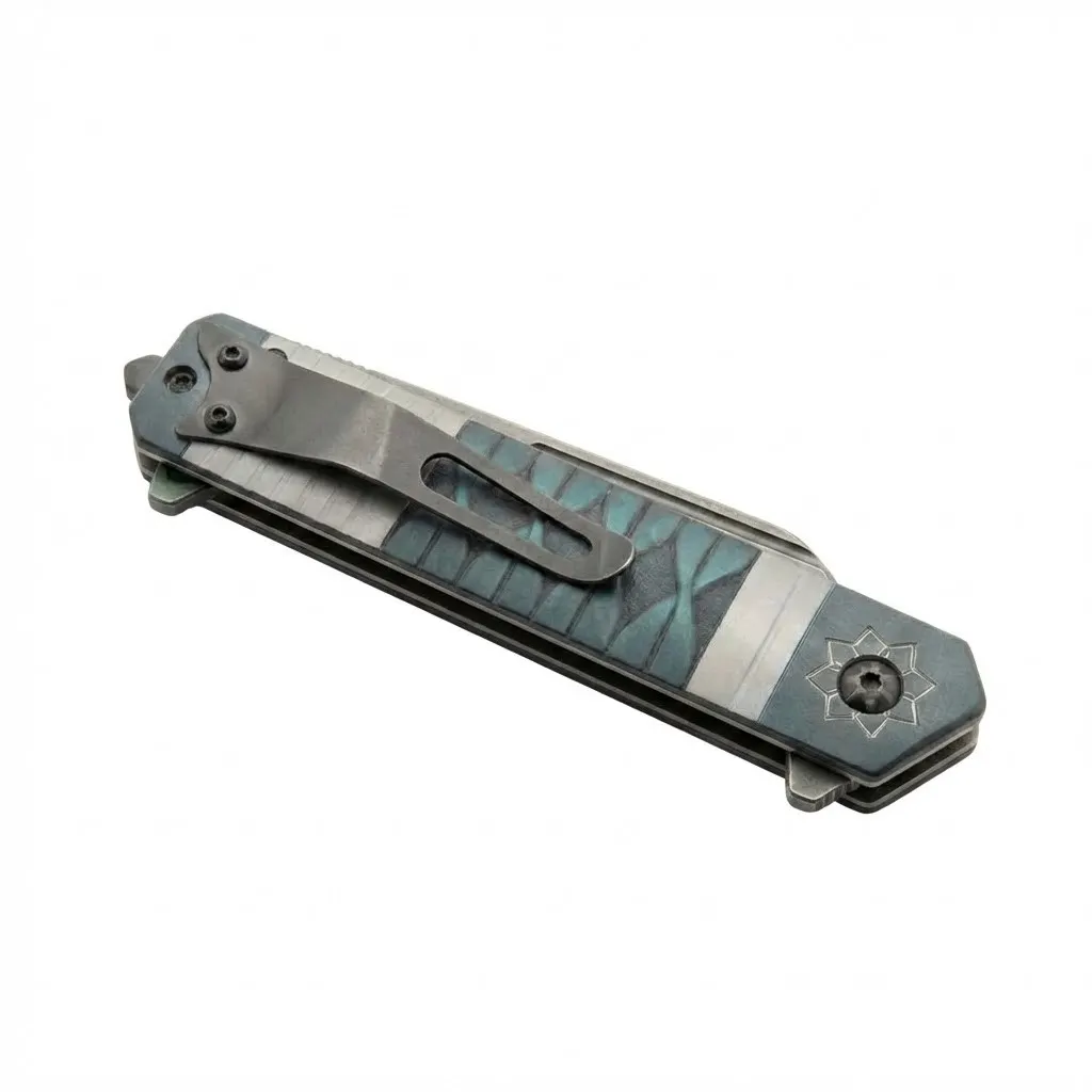 The blade is crafted from 3Cr13 Stainless Steel, selected for its balance of corrosion resistance and edge retention. While this steel is perfect for daily utility, those looking for premium edge geometry and unique patterns may also want to explore our Damascus Knives collection. The aluminum handle scales are precision-machined from high-strength alloy, featuring a segmented design in a striking white, black, and green color scheme. This machined chassis provides a solid, impact-resistant foundation that synthetic handles cannot match.