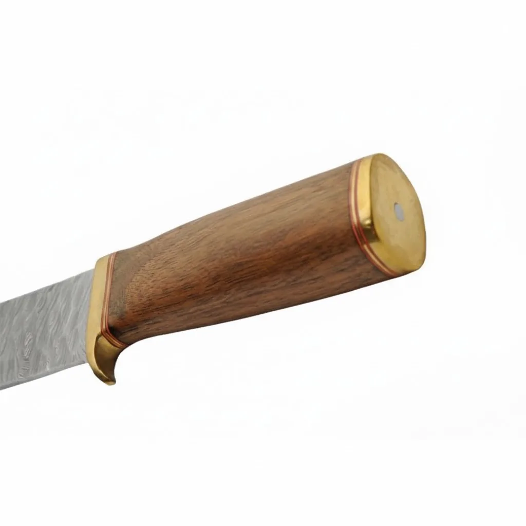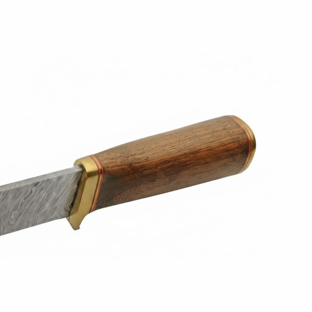 At the core of this knife is a Damascus knives featuring a heavy hammered (tsuchime-style) finish. This construction provides the durability required for rugged field use while maintaining a razor-sharp edge. The handle is crafted from solid wood, selected for its rich grain structure and natural warmth, and is finished with high-polish brass hardware.