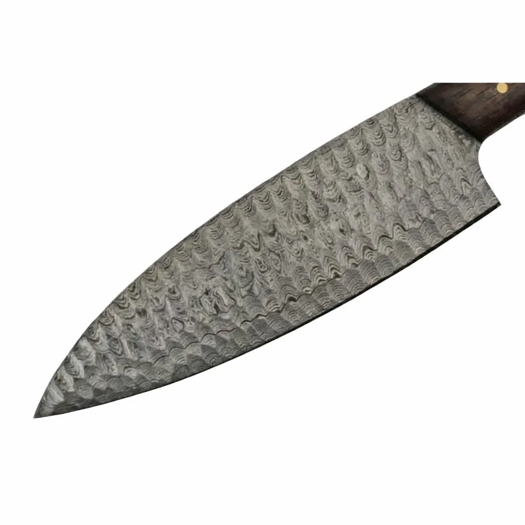 With a 10.5” overall length, the blade profile follows a traditional chef style, allowing for smooth rocking motions during food preparation. The integrated finger choil and contoured wood handle provide a secure, comfortable grip, while the full-tang construction ensures the knife can withstand rigorous daily use without compromising balance.