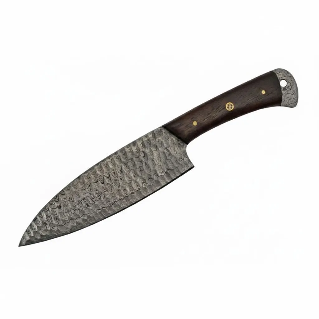 The Heritage Hammered hand-forged Damascus chef knife is a testament to traditional bladesmithing, providing a versatile tool for both the professional kitchen and the field. This fixed blade features a striking hammered texture on the upper flats, paired with a high-contrast Damascus pattern that ensures every piece is visually unique.