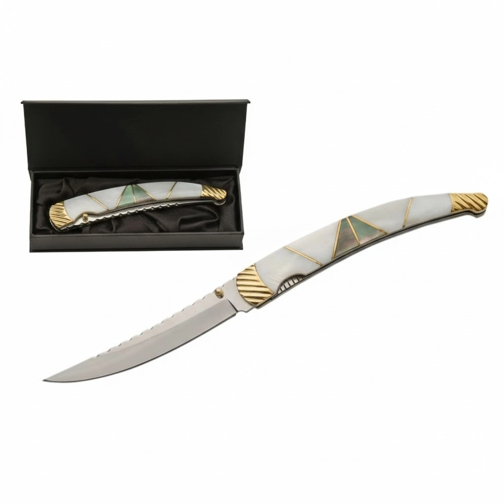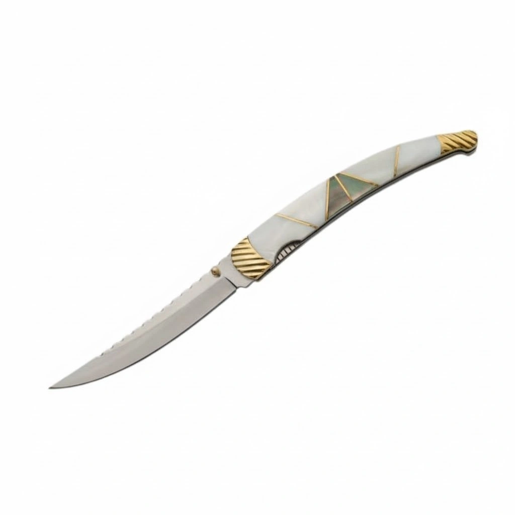 The blade is forged from high-grade stainless steel, designed for lasting edge retention and corrosion resistance. The handle is the centerpiece of this design, masterfully inlaid with genuine Mother of Pearl and Abalone. These delicate materials are framed and reinforced by polished brass bolsters, providing a classic gold-tone contrast and a timeless look for the modern collector.