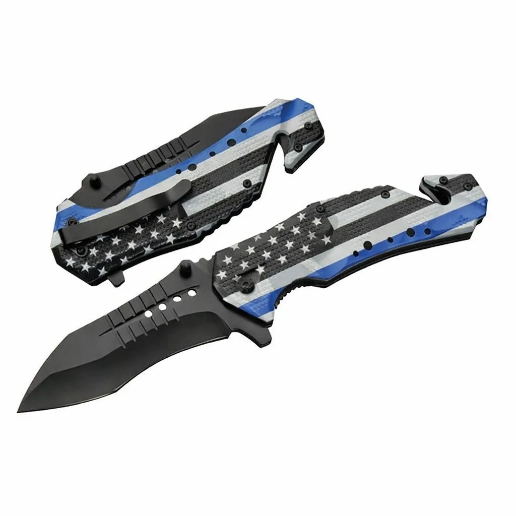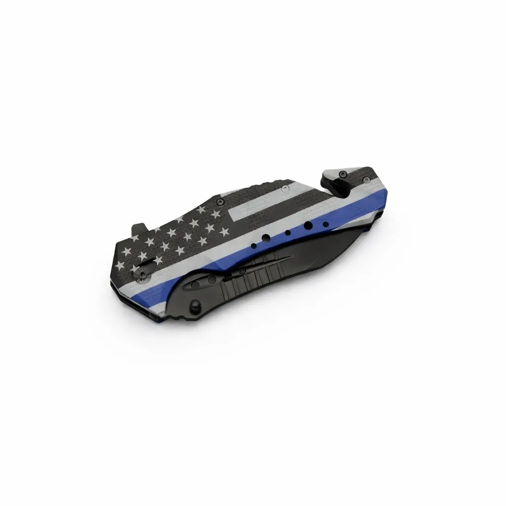 The Police Flag Linerlock is a purpose-built aluminum folding knife featuring a 3Cr13 black stainless steel blade and integrated emergency tools. Designed with a patriotic thin blue line motif, this folder combines symbolic craftsmanship with essential survival features like a seatbelt cutter.