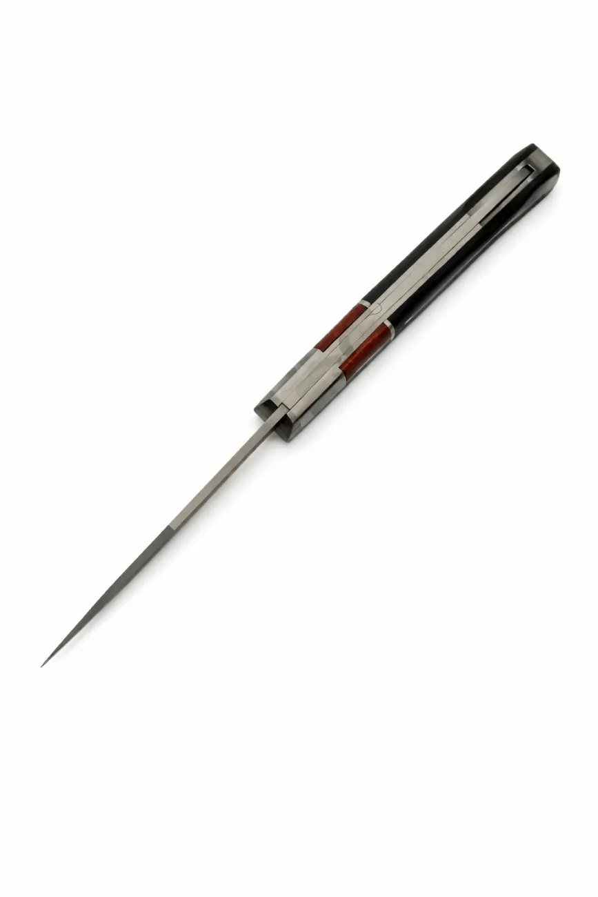This blade is forged from high-quality stainless steel, chosen for its excellent corrosion resistance and ease of maintenance in the field. The handle is crafted from premium pakkawood in a striking black and cherry-wood finish, providing the durability of a composite with the refined feel of natural timber.