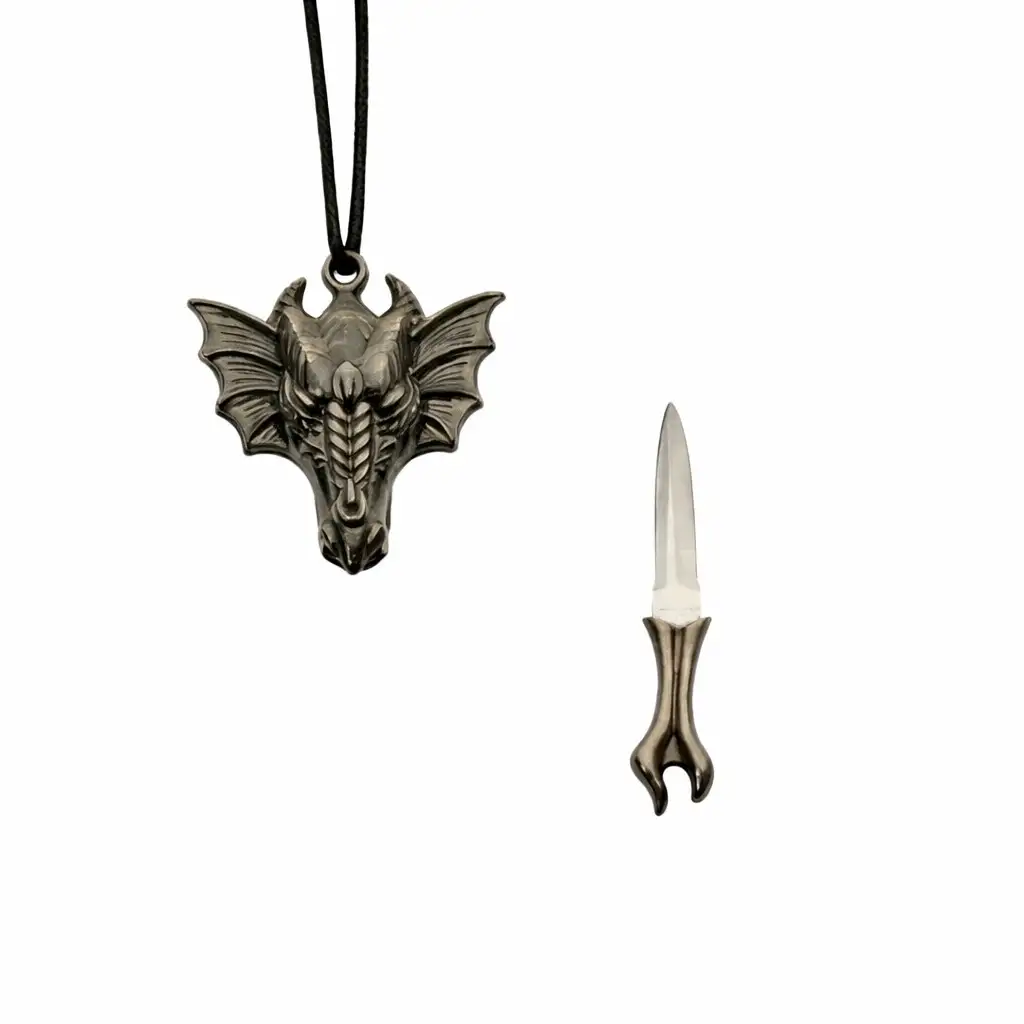 The Dragon Head is a unique specialty fixed blade designed to be worn as a functional piece of jewelry. This stainless steel dragon head neck knife features a concealed blade that sits securely within the alloy body, providing a discreet cutting tool that is always within reach. Whether used for opening packages or as a conversation piece for collectors, it balances ornate craftsmanship with practical application.